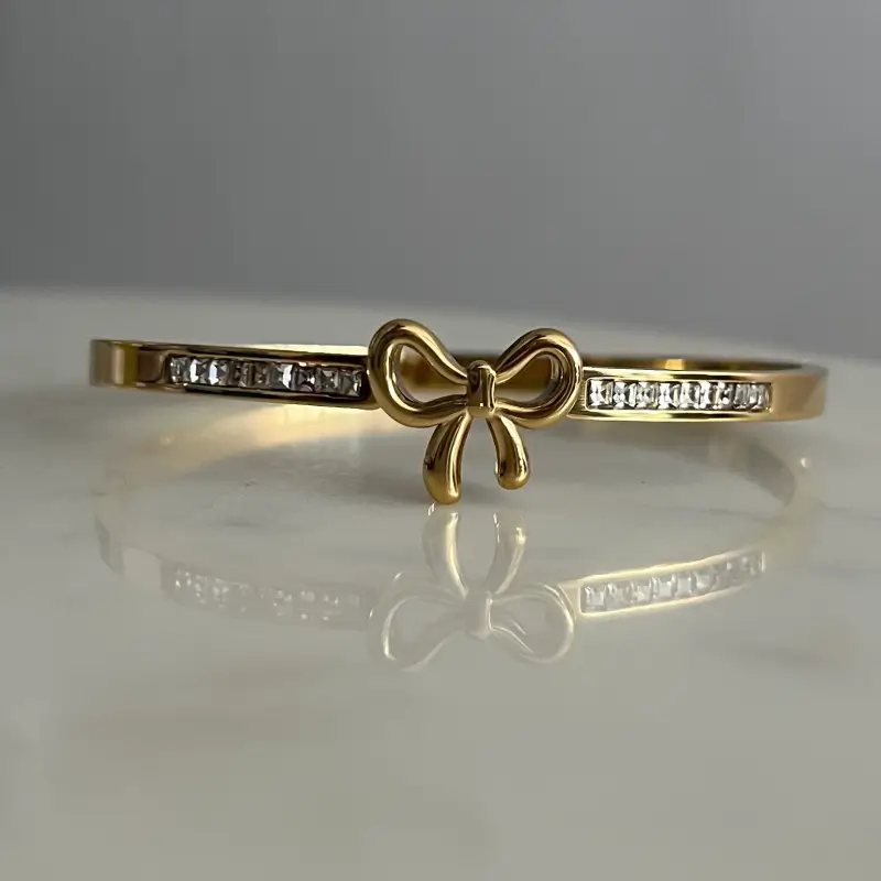 Gold Plated Stainless Steel Anti-Tarnish Bow Diamante Band Bracelet